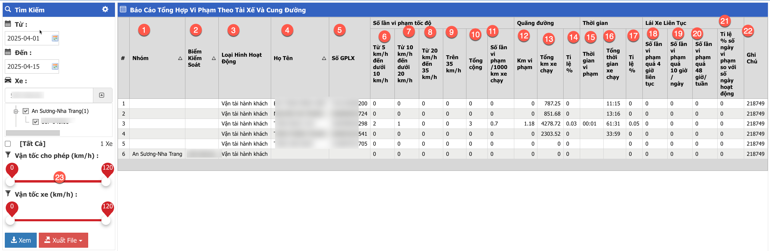 23 | Vận tốc cho phép (km/h) / Vận tốc xe (km/h) | Người dùng có thể kéo slide để lọc vận tốc khi xem báo cái |