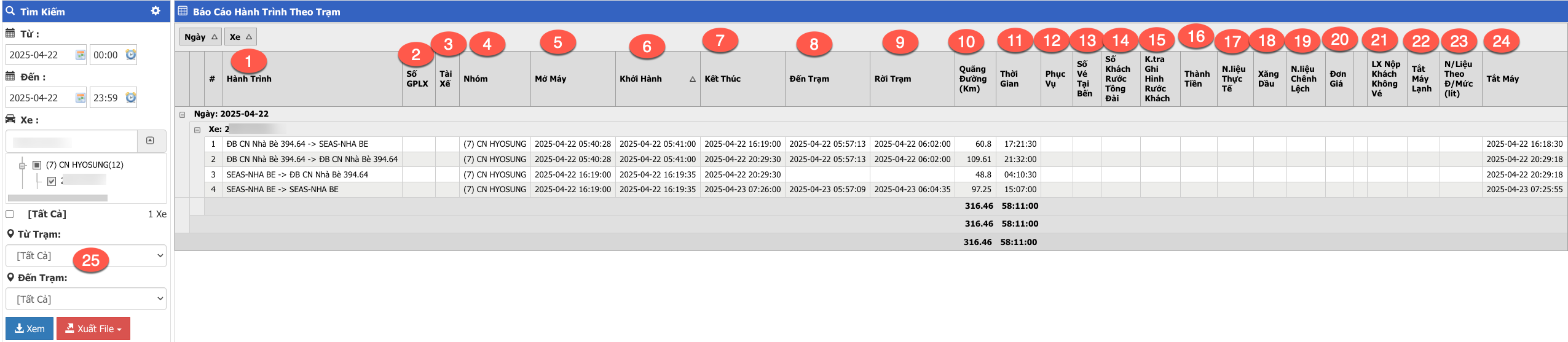 | 25 | Từ trạm/ Đến trạm | Người dùng có thể lọc trạm để xem báo cáo |
