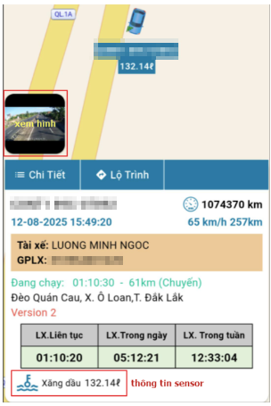 - Sensor: Xem được thông tin loại sensor (xăng dầu, nhiệt, ...), số liệu hiện tại, nhưng không xem được biểu đồ